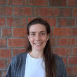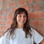 Portrait einer jungen Frau mit braunen Haaren vor einer roten Ziegelwand. Die Frau lächelt.